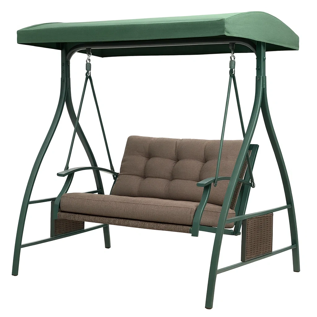 Balancelle en métal avec coussin en tissu vert et brun
