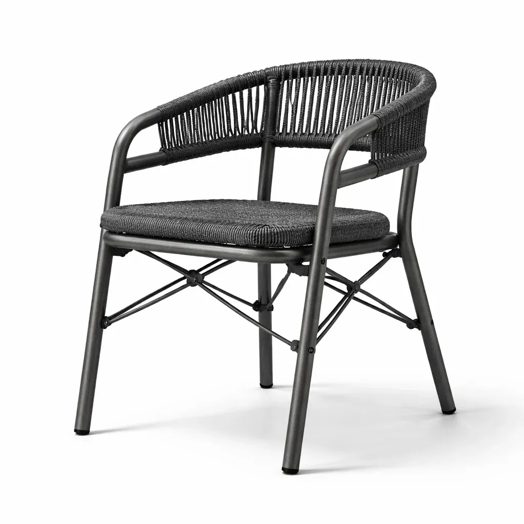 Chaise à manger en acier et rotin noir avec dossier arrondi