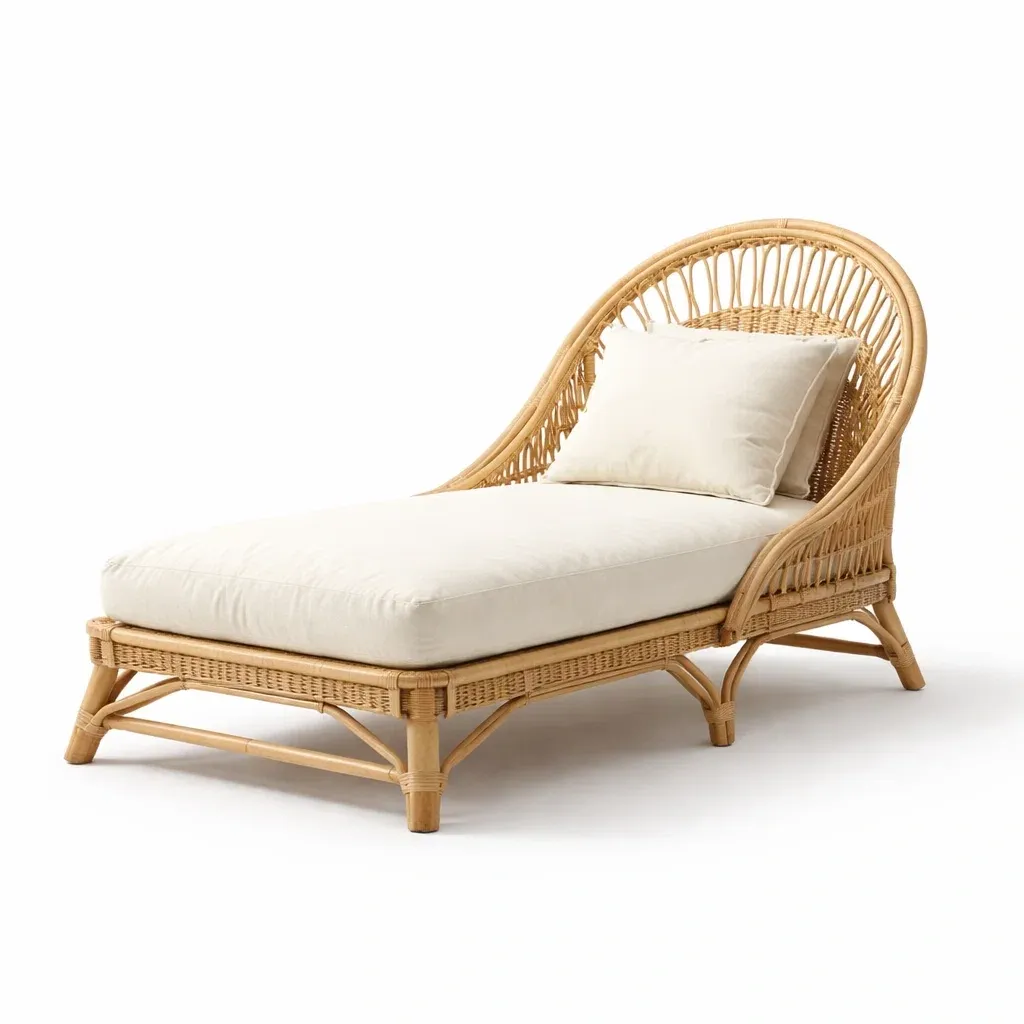 Chaise longue en rotin avec coussin en tissu beige 140 cm x 70 cm x 85 cm