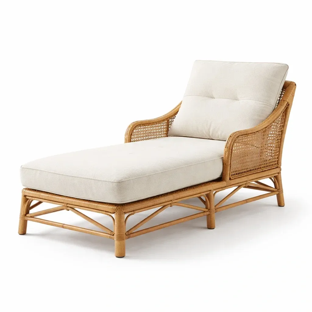 Chaise longue en rotin beige avec coussin en coton et polyester