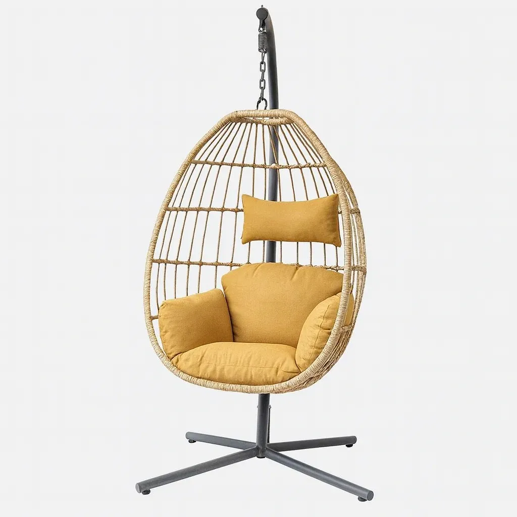 Fauteuil suspendu en forme d'œuf en rotin synthétique avec coussin jaune